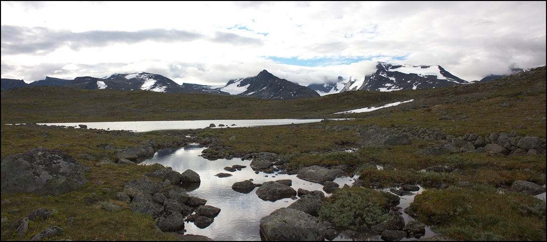 Dolina Memurubu doskonale sprawdziła się w roli noclegowni. Mimo, że Słońce schowane było za chmurami, kolejny dzień wędrówki zapowiadał się ciekawie. Szlak prowadził nas wzdłuż potoku Muru, który z wąskiego i rwącego, powoli zmieniał się w wielokorytowy, "załaszony" ciek. Maszerowaliśmy w górę doliny, której początek stanowił gigantycznych rozmiarów kocioł, ograniczony łukiem masywów, z których najbardziej okazałym wydawał się być Memurutindane (2148 m n.p.m.). Przyszedł czas na pierwsze tego dnia „wspinanie”. Dość szybko w towarzystwie małych jezior, osiągnęliśmy grzbiet. Po drodze mijaliśmy wielu Norwegów, którzy ze względu na ekstremalnie duże plecaki bacznie się nam przyglądali, jednak mimo to, żaden z nich nie zatrzymał się na małą pogawędkę. Norwegowie nie mają w sobie ciekawości…Wyjątkiem był pan w sile wieku, który pijąc herbatę skwitował otaczające nas krajobrazy krótkim „This is life”.